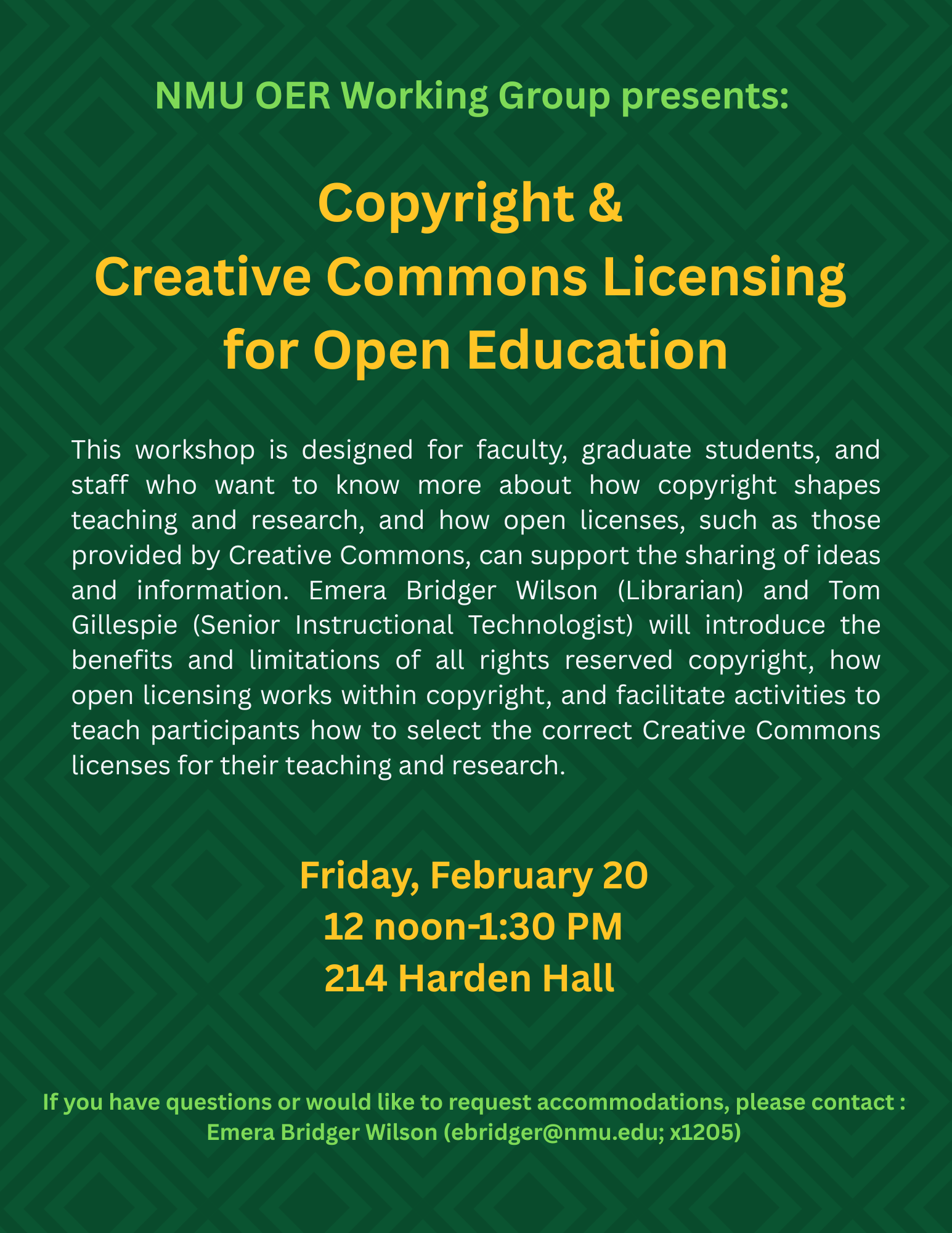 This workshop is designed for faculty, graduate students, and staff who want to know more about how copyright shapes teaching and research, and how open licenses, such as those provided by Creative Commons, can support the sharing of ideas and information. Emera Bridger Wilson (Librarian) and Tom Gillespie (Senior Instructional Technologist) will introduce the benefits and limitations of all rights reserved copyright, how open licensing works within copyright, and facilitates activities to teach participants how to select the correct Creative Commons licenses for their teaching and research.