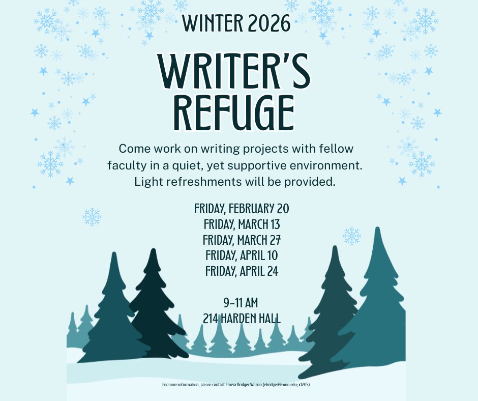Feb 20 09:00 am - 11:00 am Where Harden Hall Rm. 214 Come work on writing projects with fellow faculty in a quiet, yet supportive environment. Light refreshments will be provided. Event Contact Information For more information, please contact: Emera Bridger Wilson (ebridger@nmu.edu; 906-227-1205).